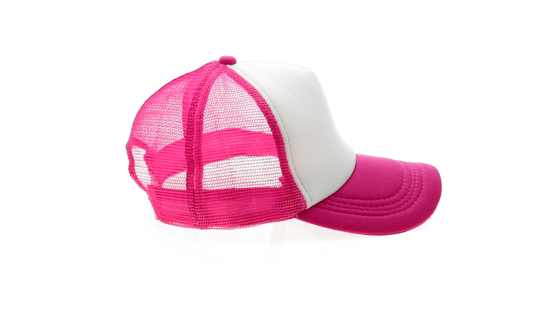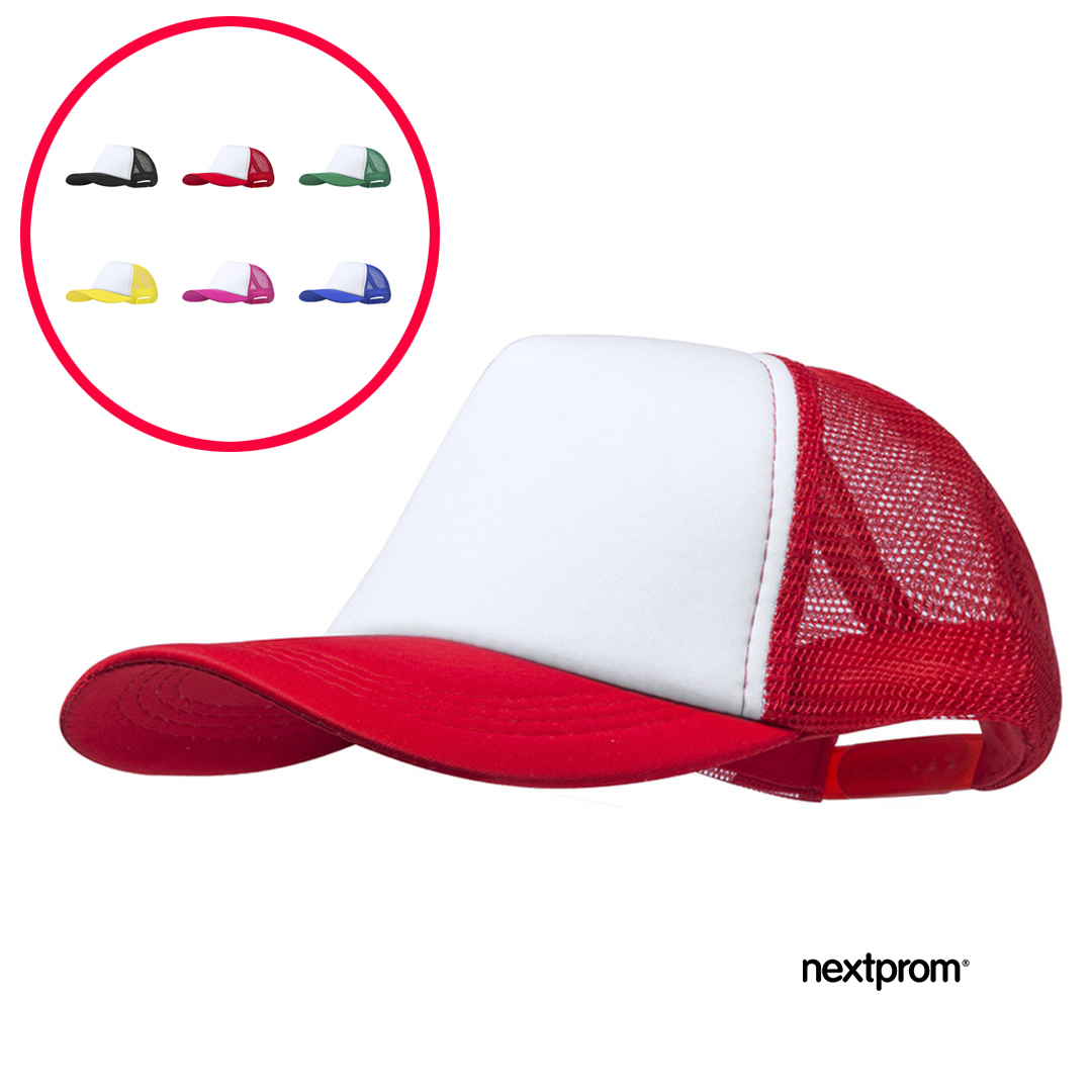 Gorras con rejilla baratas 5 paneles fabricadas en poliéster de suave acabado, frontal blanco y rejilla de color, cierre ajustable de plástico.