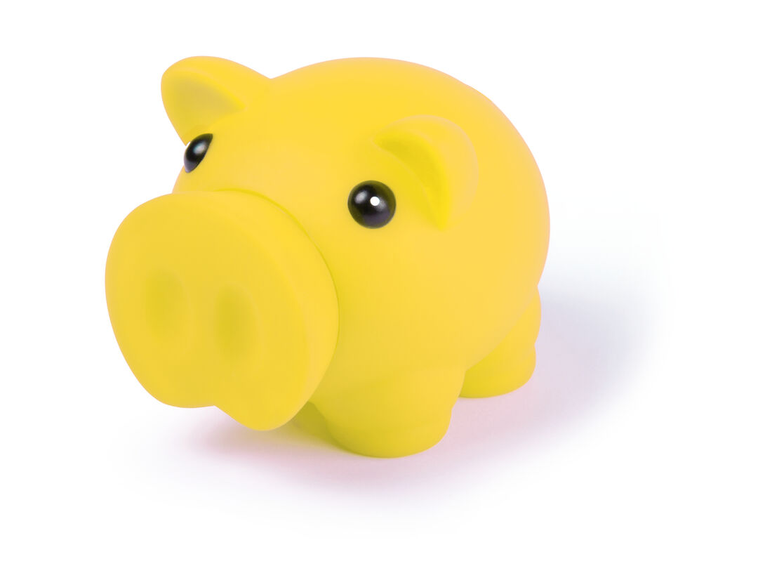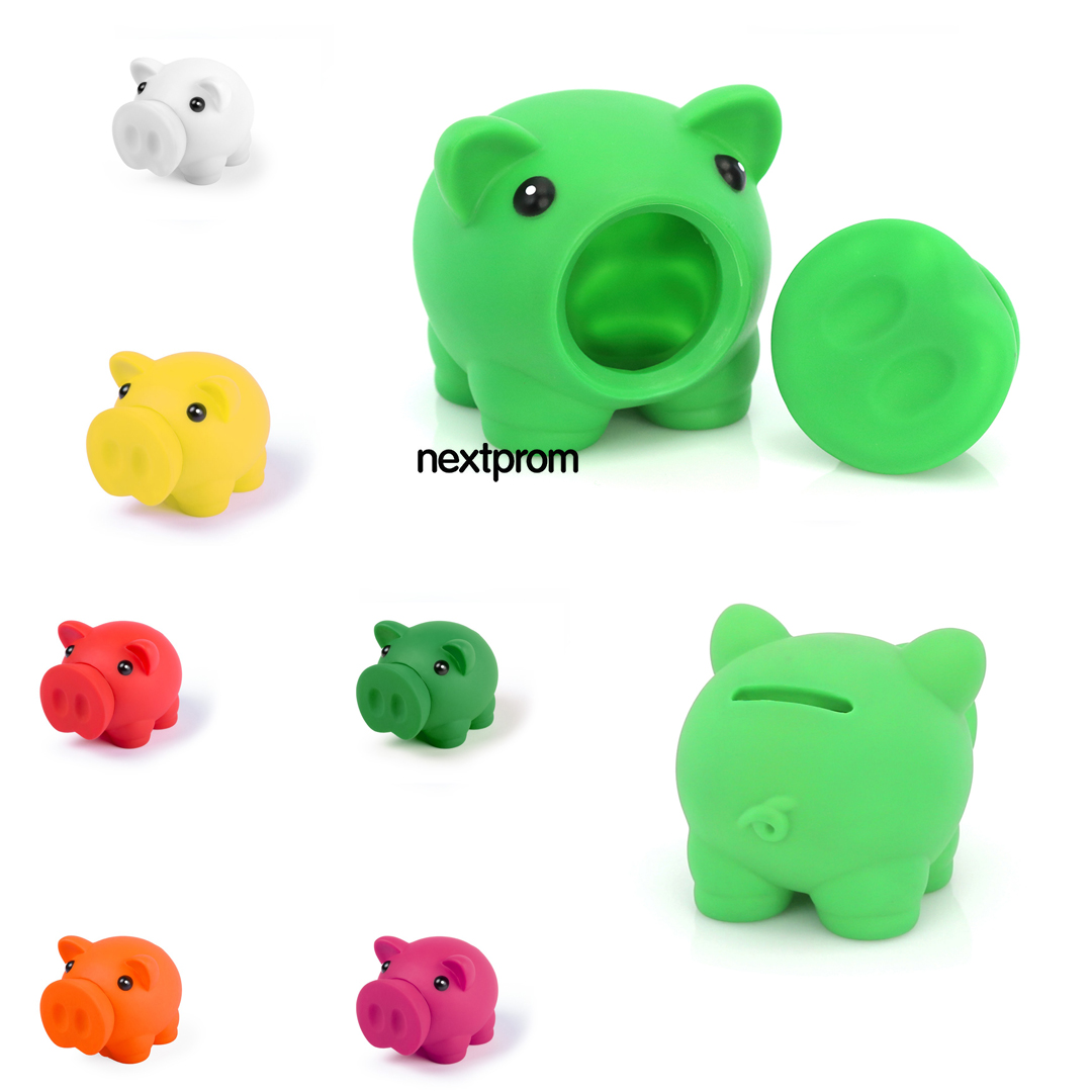 - Hucha cerdito con suave cuerpo de acabado goma PVC de diferentes colores.