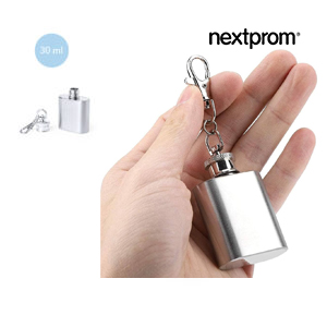 - Llavero petaca fabricado en acero inoxidable, de 30 ml de capacidad.