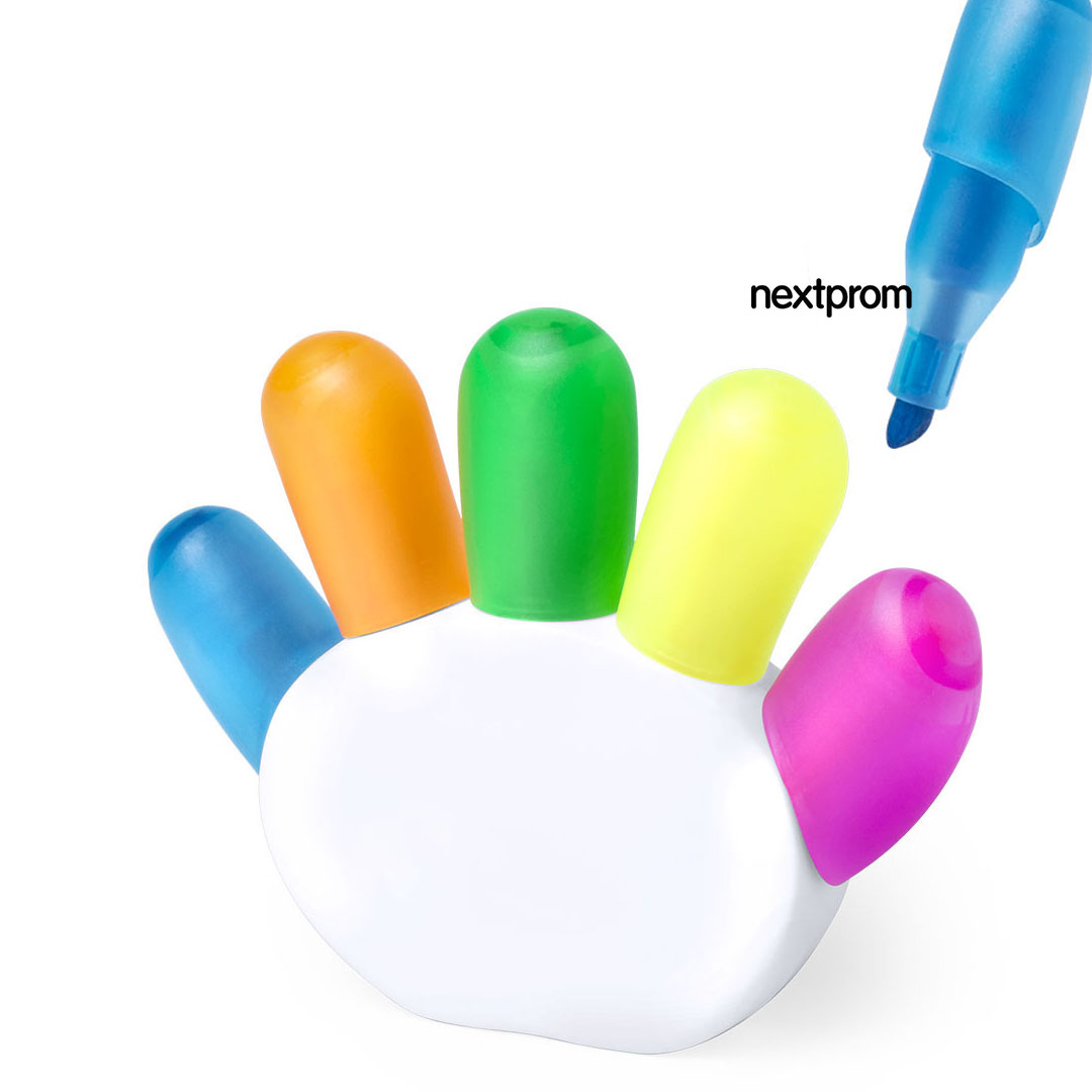- Incluye 5 marcadores fluorescentes de original diseño y soporte en color blanco.