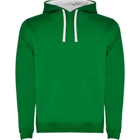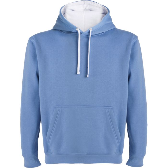- Sudaderas bicolor urban Marca Roly: Capucha de doble tejido, con cordón contrastado ajustable, cubrecosturas en el cuello y bolsillo canguro.
