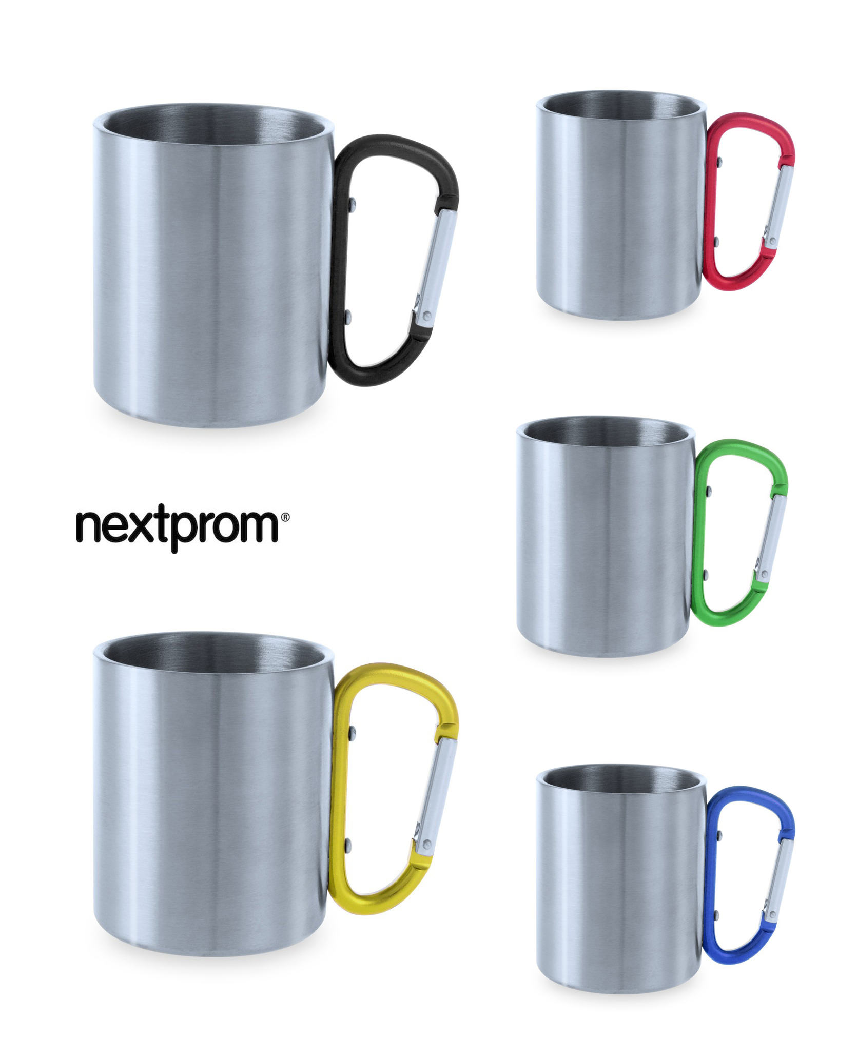 - Tazas de acero inoxidable con mosquetón de diferentes colores: azul, verde, amarillo, negro y verde